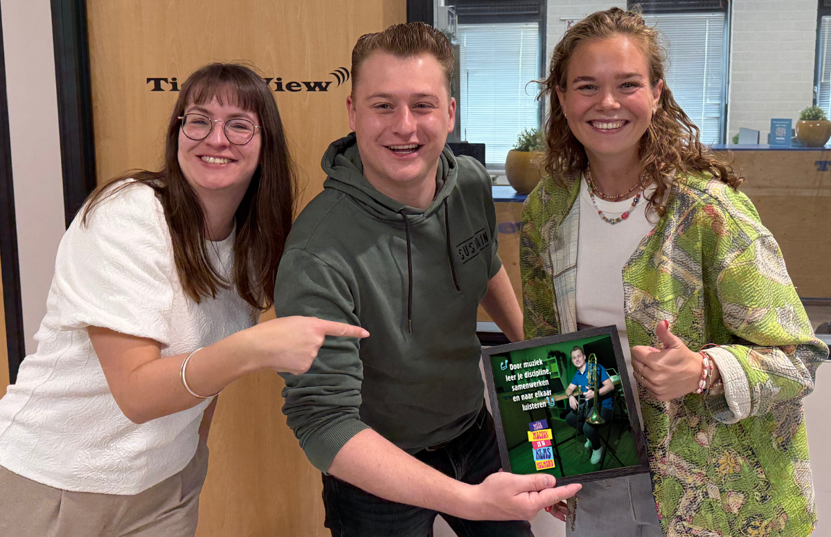 Als dank voor hun medewerking aan de campagne voor Méér Muziek in de Klas Helmond gingen Frederique en Ingrid bij hen langs met hun ingelijste foto.